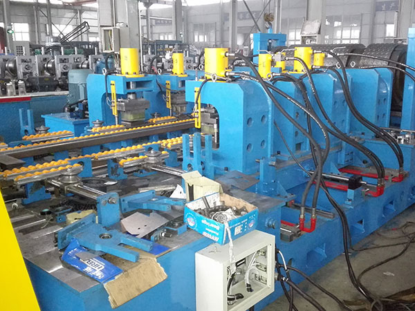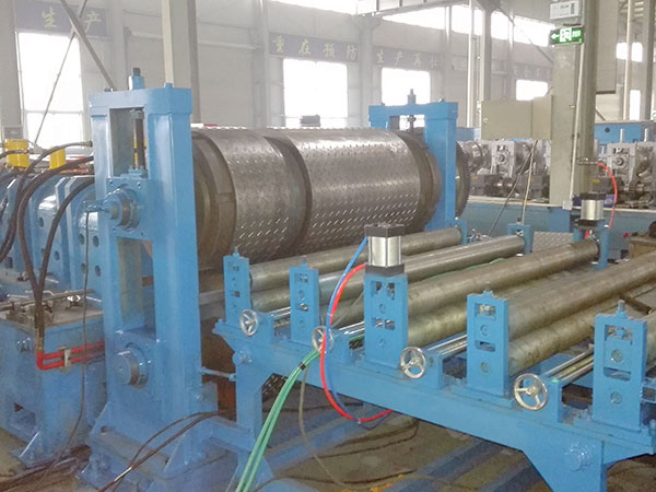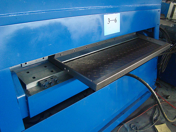 This machine is mainly used for the integrated production of carriage steel floor plate with side board, anti-theft door plate and cabinet body, with function of tri-side forming and cutting, punching, edge-cutting and decorative pattern rolling on the plate. The length and width of product can be adjustable. The machine has advantages of high efficiency, good manufacturing and labor saving.